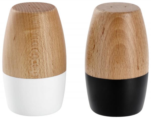 Beech wood salt/pepper shaker set. Salt shaker is white, pepper shaker is partially painted black to make the contents visible to the outside.