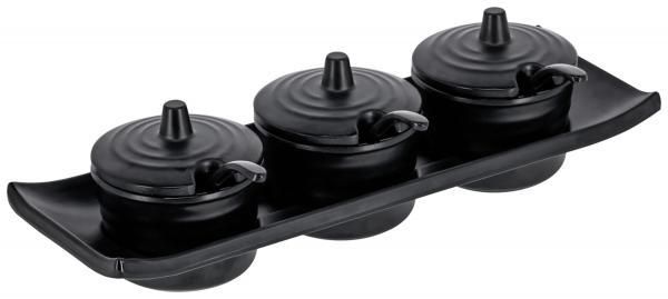 Set of spices made of melamine. The set consists of a tray and three containers including lids and spoons. Particularly durable and hard-wearing due to high resistance to impact and breakage. Application range between -30°C to +70°C. Dishwasher safe.
