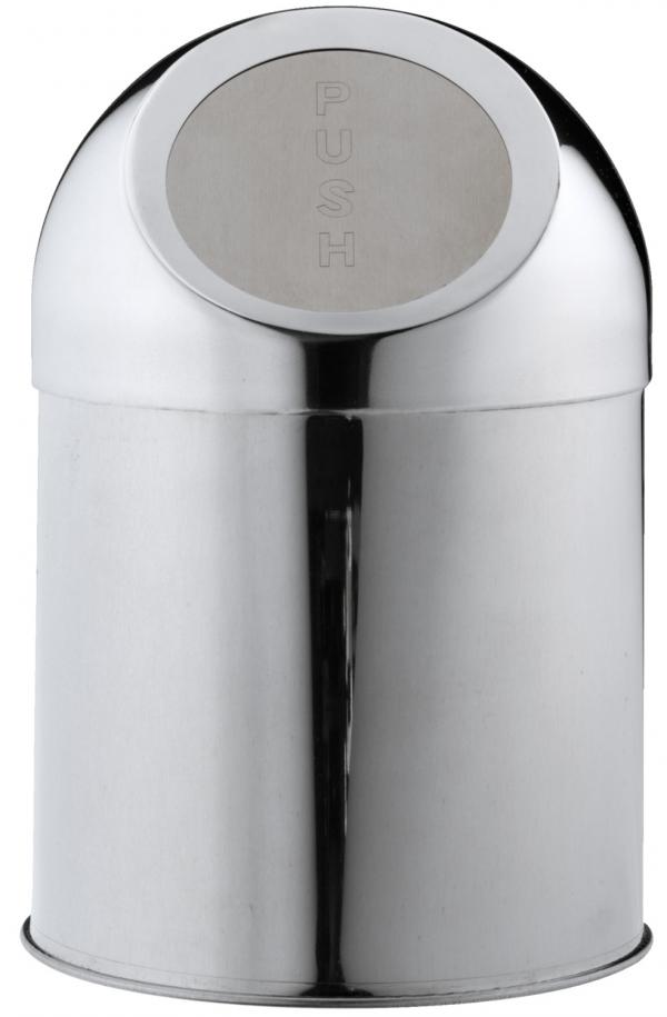 Closed tabletop garbage can made from 18/0 chromium stainless steel (container) and stainless steel (lid). With removable push-operated lid. Dishwasher-safe.