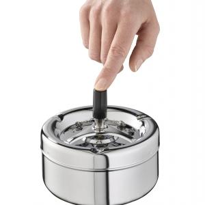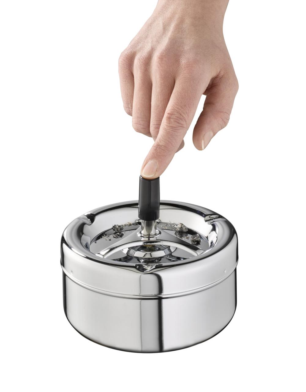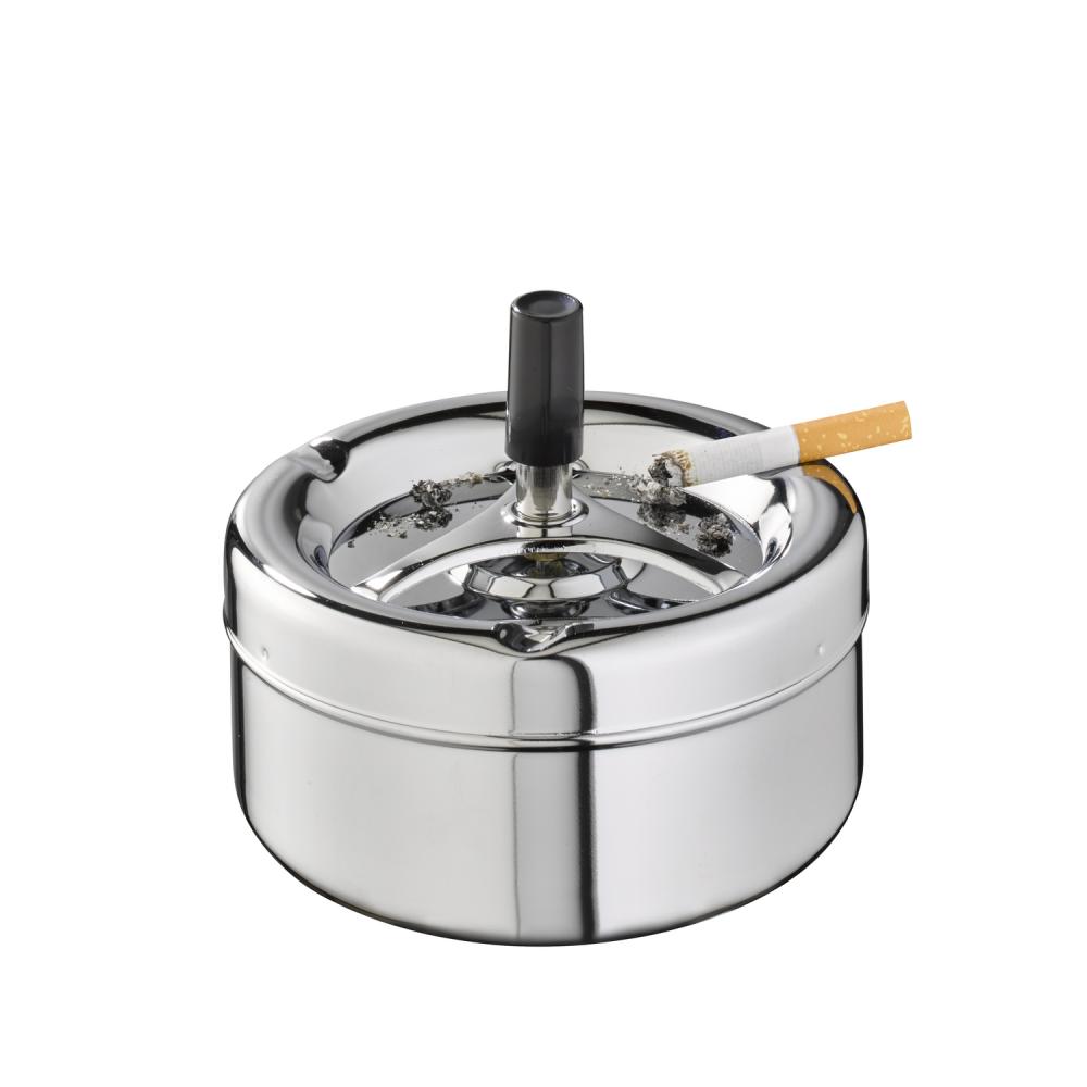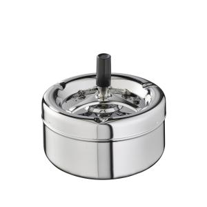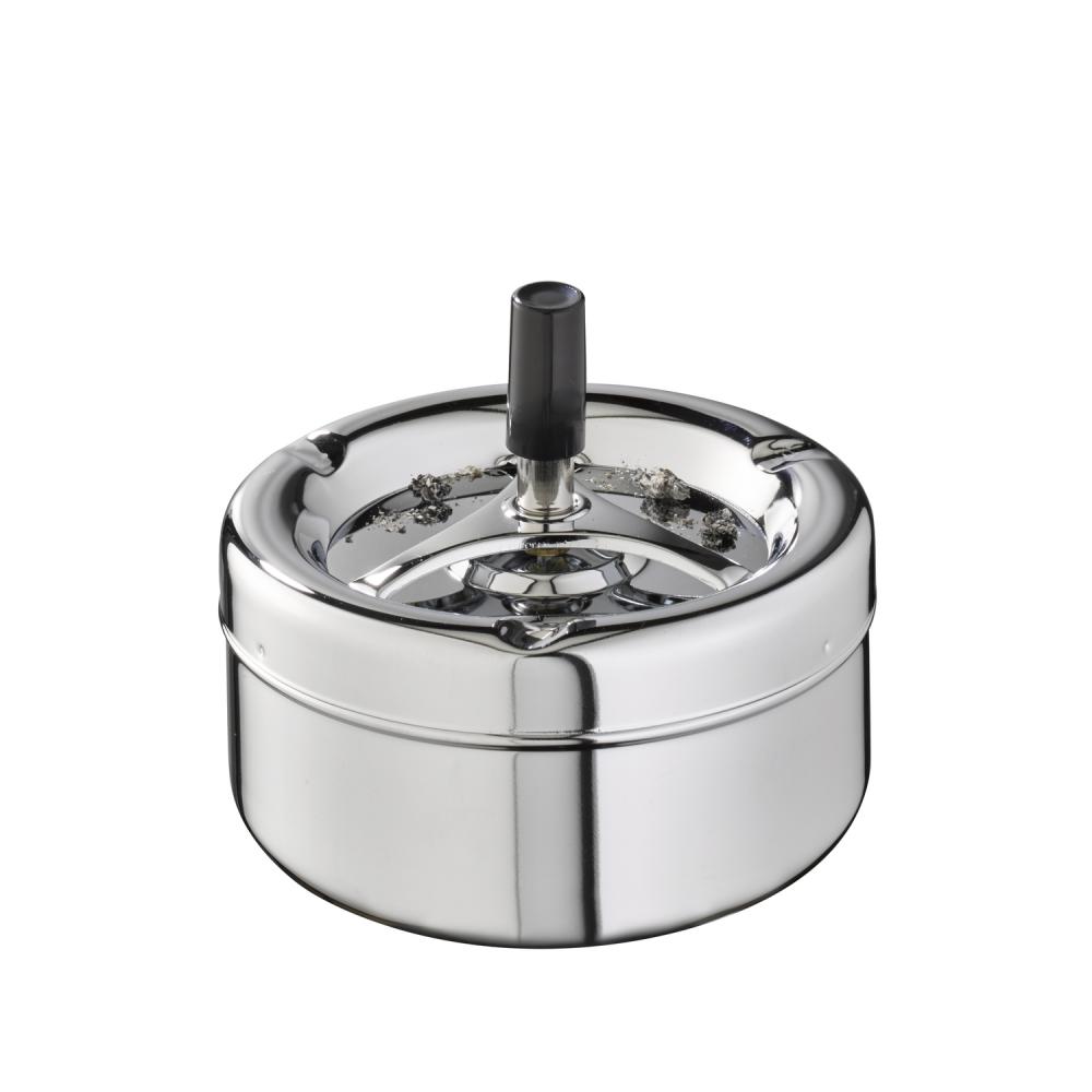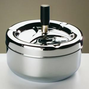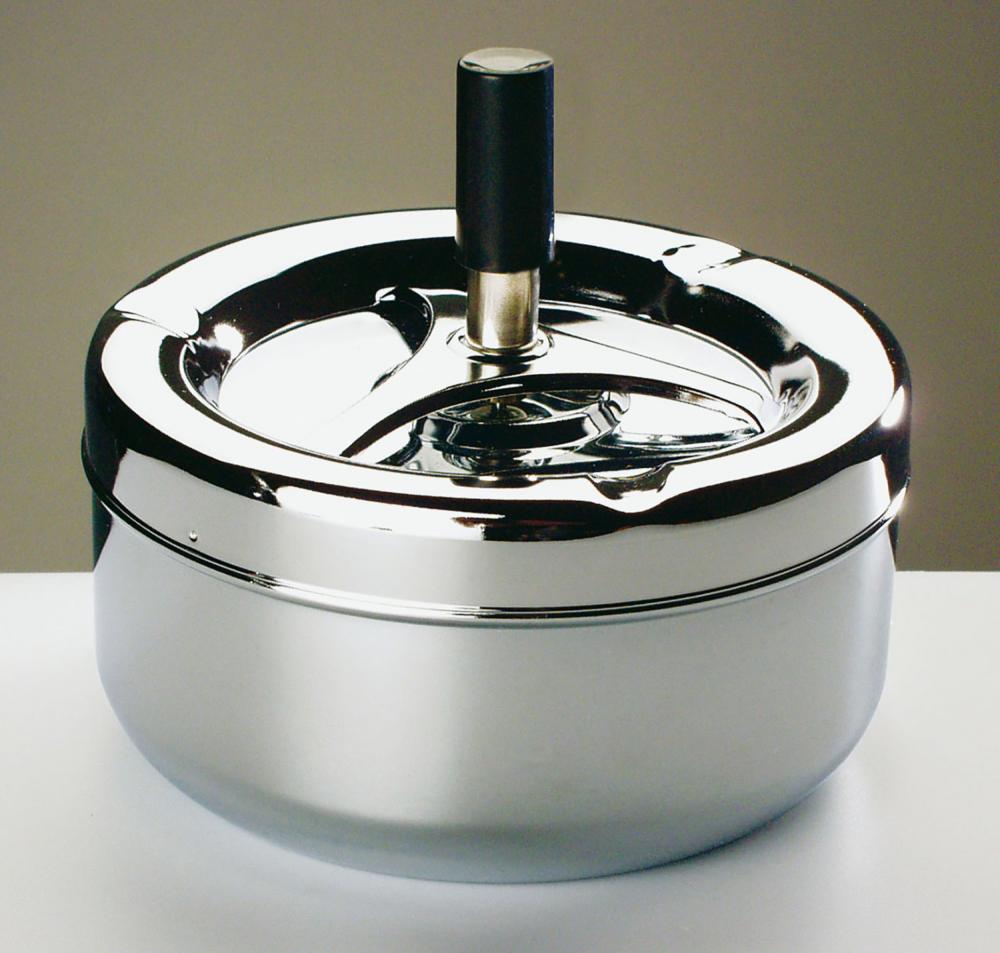 The KLASSIKER rotary ashtray from APS is silver and has a chrome-plated lid with a rotating mechanism, which ensures that the ash develops as little smoke odour as possible while smoking.