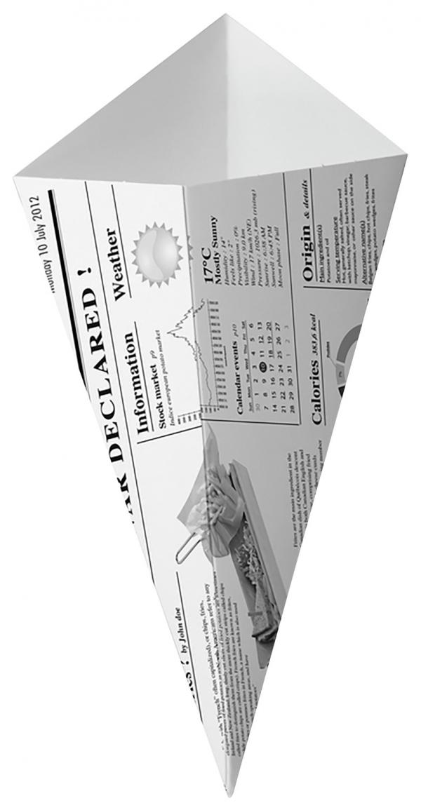 French fries cone made of kraft paper in newsprint design without inner coating. Extra sturdy for chips or wedges as to-go packaging. Temperature resistant up to +100°C.