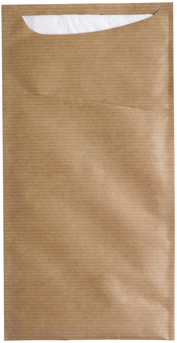 Cutlery bags in a robust material mix of ribbed paper, kraft paper and cellulose. Incl. inserted napkin (dimensions 33x40 cm, two-ply). Available in several attractive colors. Material mix (90 g/m²).