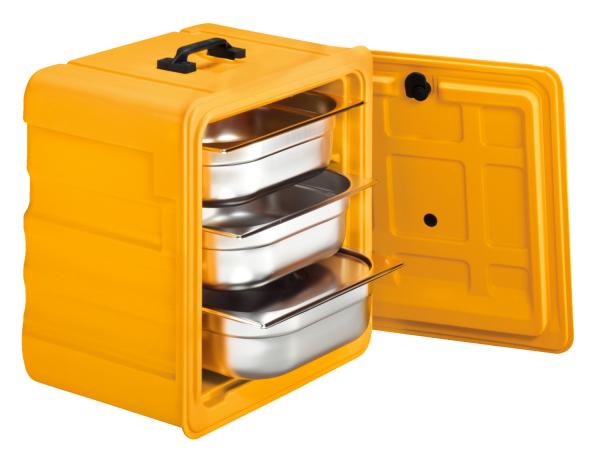 With 6 slide-in rails for GN containers and an interior height of 35.5 cm. Capacity max. 3x GN 1/2 - 100 mm. Net capacity 19.5 liters. Weight 6.0 kg. For hot and cold transport of food in GN containers. High reliability, hygiene and very good temperature maintenance characterize the boxes. Made of high-quality, pollution-free polypropylene with double-walled polyurethane insulation (CFC-free). Seamless insulation foam. Thanks to the very good insulation, the heat loss is less than 1.5°C per hour. Cold loss only 0.5°C per hour. All containers are stackable with each other and suitable for temperatures between -40°C and +100°C. Suitable for dishwashers. Delivery without GN container. Please order matching gutters and GN containers at the same time.
