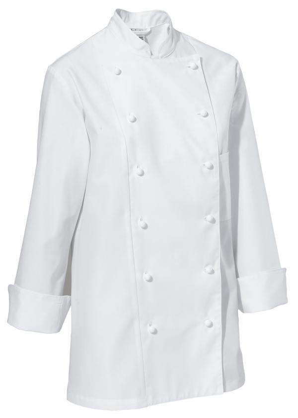 Women`s chef jacket Aila long sleeve The women`s chef jacket Aila long sleeve combines classic chic and optimal protection. The women`s chef jacket has long sleeves that can be practically folded over. It closes by means of a double button placket for removable buttons and has a patch breast pocket. The simple women`s chef jacket has a straight cut. Thanks to the robust and easy-care blended fabric, even stubborn dirt can be washed out in the boil wash. Ball buttons are not included and can be ordered separately in many colors. * Chef jacket for ladies * With double button placket for removable buttons (please order separately) * With patch breast pocket * Color white * Chef clothing made of extra durable material * Easy to button in case of soiling in the front possible * Available in many sizes * Made of 65% polyester and 35% cotton * Easy-care wash at 95°C (boil-proof) * Weight 215 g/m² The women`s chef jacket Aila long sleeve combines all-round protection and maximum wearing comfort. It is a real all-rounder in the kitchen and protects against frying fats, dishwater and other soiling. After the shift, it can be washed in the washing machine at 95°C. Supplied without ball buttons.