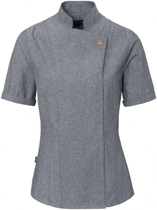 Stylish chef jacket available in half and long sleeve. Closeable by snap buttons. 2-split sleeve pocket on the left and bib loop on the neck. Available in two materials: Genuine denim (color denim light) or chambray (grey). Material: 100% cotton. 255 g/m² (denim) or 170 g/m² (chambray). 40 °C wash. Back length women: 68 cm at size 36. Back length men: 76 cm at size 50.