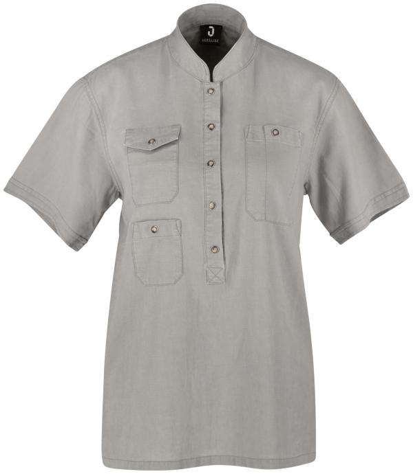 Lightweight, short-sleeved shirt for women made of robust and breathable cotton linen fabric. Once pre-washed it gets its distinctive, slightly creased linen look. Straight cut, with stand-up collar, 3 patch pockets with snap buttons and bib loop at the neck. The deep button placket at the front with high quality snaps makes it easy to put on over the head. Embroidery for personalization possible. 45% cotton, 55% linen, 180 g/m². 60°C wash. Back length: 69 cm for size 36.