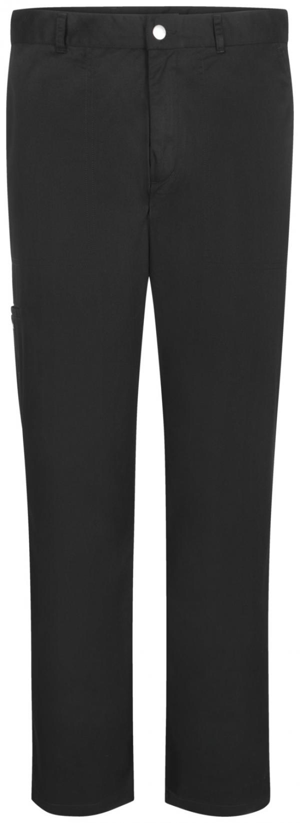 Men`s chef trousers made of easy-care, hard-wearing mixed fabric with straight cut, 2 attached mesh pockets and 1 back and 1 side pocket with press stud closure. JOBELINE availability guarantee. Material: 65% polyester, 35% cotton. 245 g/sqm. 60°C wash. Inner leg length: 80 cm at size 50.