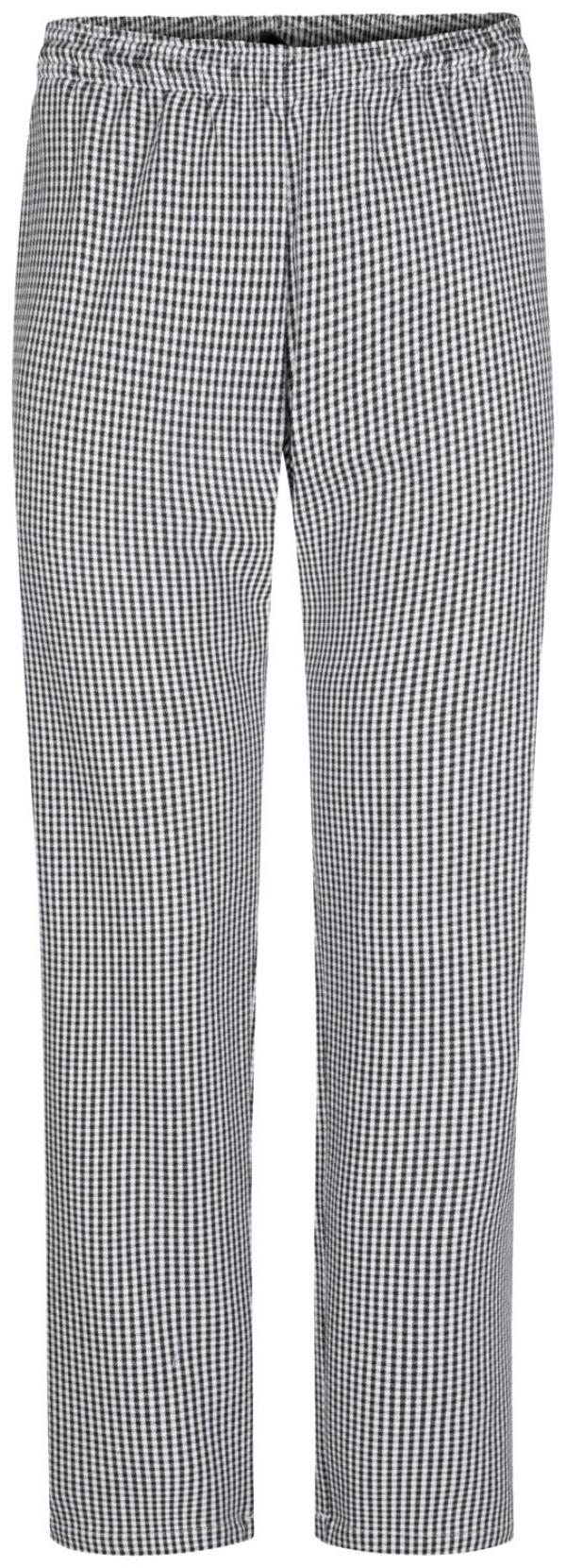 Rubber waist trousers in hound`s-tooth with cord, 2 side pockets and 2 attached pockets. Material: 100% cotton. 240 g/m². 60°C wash. Inner leg length: 84 cm at size 50.