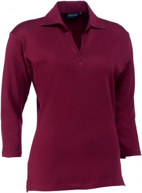 Fitted women`s polo shirt in 3/4 sleeve with V-polo collar and small side slits. JOBELINE availability guarantee for the colors white and black. Material: 95% cotton, 5% elastane. 40°C wash. Back length: 60 cm at size S.