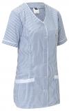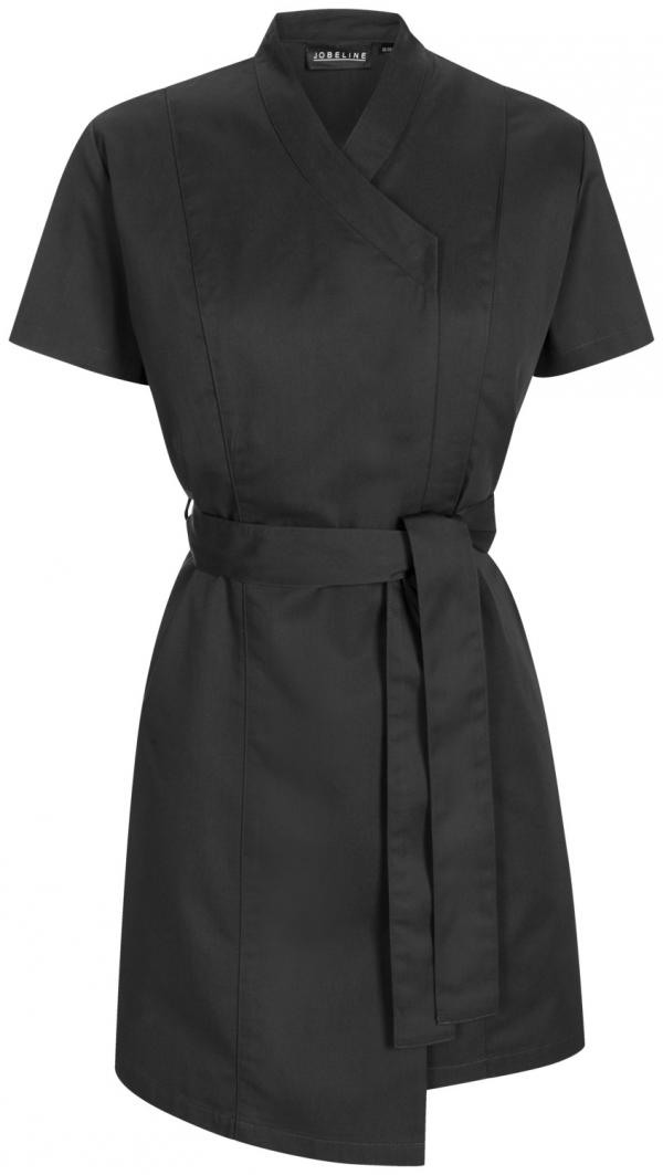 Easy-care women`s short-sleeved tunic with full-length concealed press button placket and two side pockets. Individually adjustable in width thanks to a belt strap. 65% polyester, 35% cotton. 60 ° C washable. Back length: 88 cm at size 36.