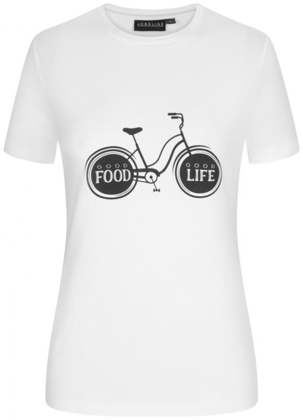 Women`s white straight-cut T-shirt with scoop neck, decorated with a bicycle print and the slogan "Good food, good life". 95% cotton, 5% elastane. Wash at 40°C. Back length: 65 cm in size S.
