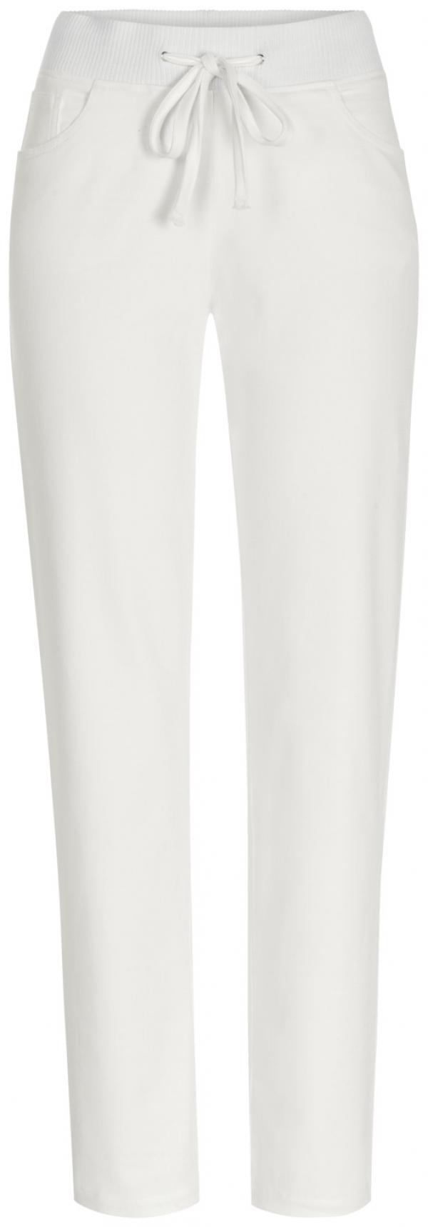 Easy-care women`s trousers in white. 5-pocket shape with elastic waistband, the width of which can be adjusted by a band. 65 % polyester, 35 % cotton. 40° wash. Inside leg length: 80 cm at size 36.