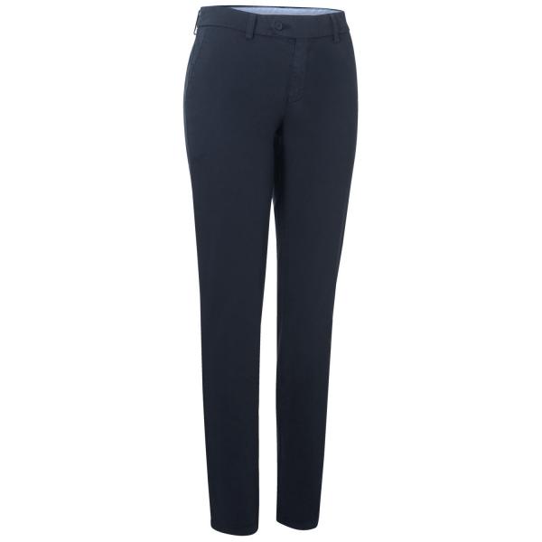 Casual chino trousers for women with stretch part for extra wearing comfort. Rubber band in the waistband prevents slipping of the blouses. Practical insert pockets with integrated pen pocket on the right and back pockets with buttons. Straight leg. Material: 97% cotton, 3% spandex. 30° wash. Inner leg length: 78cm at size 36
