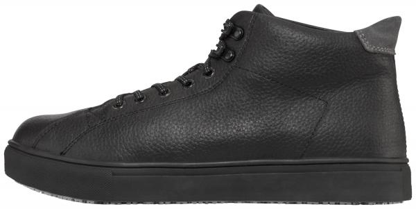 Black ankle-high leather work shoes for men and women. Complies with the standard EN ISO 20347:2012. Upper: 100% leather, lining: 100% kid leather. Water-repellent, with reflective shoelaces, a removable and anatomically shaped footbed, and a leather lining to guarantee an optimal environment for your feet. Laced using eyelets and two hooks, so that the shoes can be put on and taken off quickly. The non-slip EVA sole complies with the SRC standard. It ensures optimal grip on wet or slippery floors, as well as being anti-static and resistant to oils and fats. Supplied with shoehorn, shoe cleaner, shoe bag and an additional pair of black shoelaces.