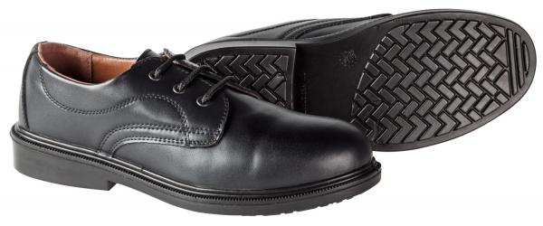 Upper material: easy-care leather, inside: leather, PU sole. Classic men`s lace-up shoe for service. With exchangeable, antistatic insole. Non-slip sole for optimum grip on wet and slippery ground. Antistatic and resistant to oils and fats. Tested to standard EN ISO 20347: 2012 (01 SRC) Color: black
