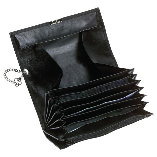 Robust purse made of black imitation leather. With hard money compartment and six bill compartments. With snap fastener. Including 30 cm long metal chain. Please order the matching holder pocket at the same time.