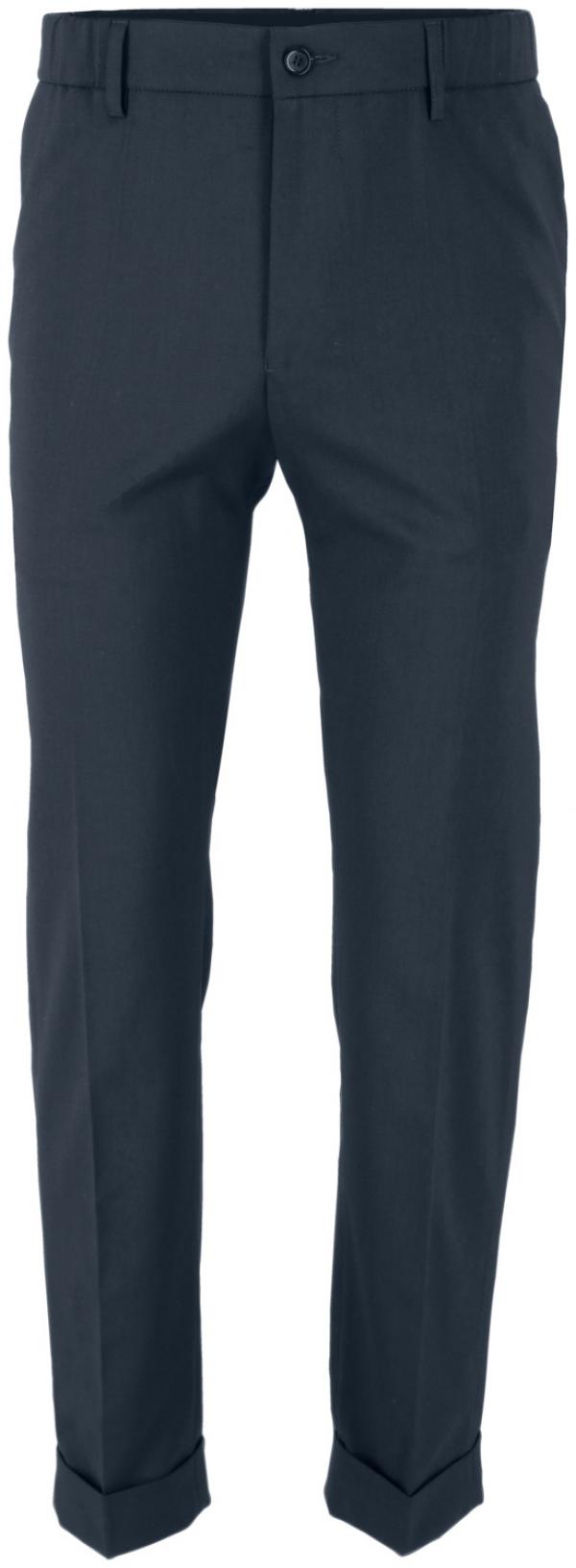 Casual, elegant slip-on waistband trousers in jogger style for men. Comfortable stretch waistband in the back and internal bands in the front to regulate the waist size. With belt loops. Practical side slit pockets and two welt pockets on the buttocks. Narrow tapered leg with lapels at the hem. Particularly crease-resistant and easy-iron material. Easy care and washable at 30°C on gentle cycle. 38% polyester, 30% wool, 30% viscose, 2% spandex. 30°C gentle wash. Inside leg length: 78 cm for size 50.