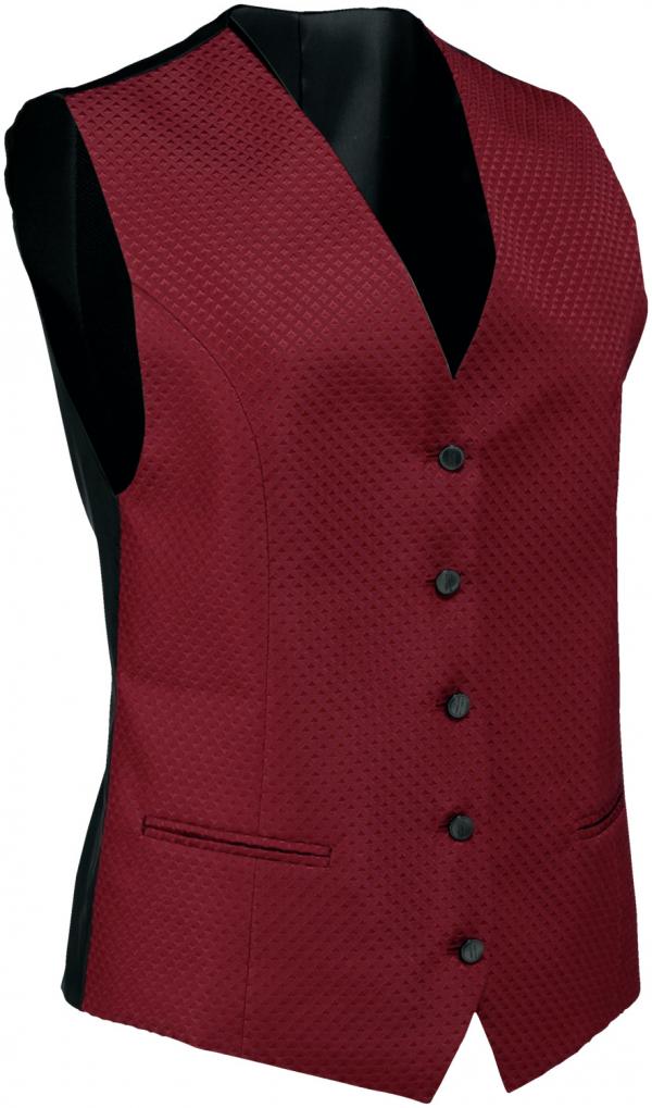 Jacquard vest made of easy-care polyester-mixed fabric in 5-button form with black taffeta back and backrest. Women`s vest: 2 piped outer pockets. Men`s vest: 3 piped outer and 1 breast pocket. Material: 100% polyester. 30°C wash. Back length women: 56 cm at size 36. Back length men: 67 cm at size 50.