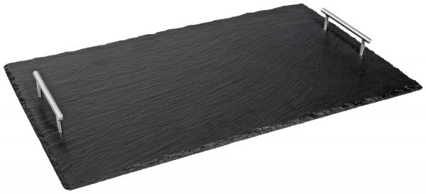 Crna tacna od prirodnog škriljevca (debljine 0,5 cm) se isporučuje sa gumenim nožicama. Povremeno polirati maslinovim uljem, tacna zadržava svoj plemeniti sjaj. Nije pogodno za mašinu za pranje sudova! Materijal ručke: hrom-nikl nerđajući čelik 18/10 nerđajući!
