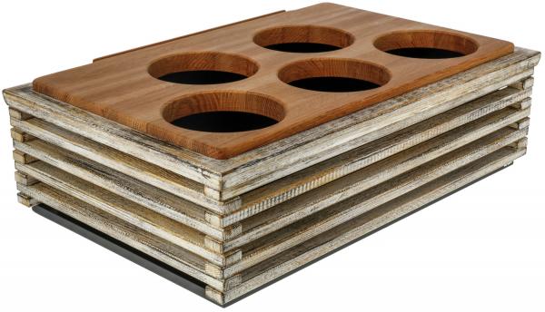 Set se sastoji od bifea visoke 1/1 napravljene od čvrstog drveta, osnovnog kontejnera od visokokvalitetne plastike sa toplotnom otpornošću do 70°C, odgovarajućeg hladnog pakovanja od polietilena i priključka za posudu za 14cm u čvrstom hrastu.