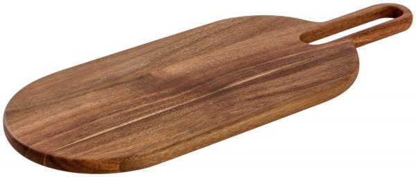 Moderna daska za hranu od nauljenog bagremovog drveta sa ručkom za nošenje i ekstra širokom rupom za vešanje u ovalnom obliku. Nije pogodno za mašinu za pranje sudova. Bezbedno za hranu.