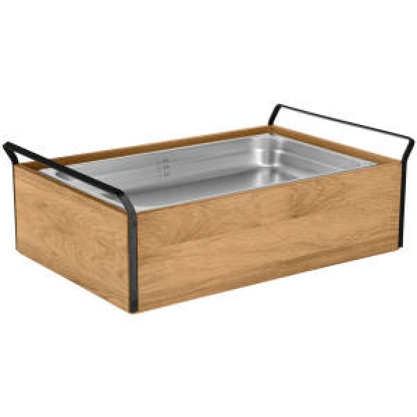Esino rashladna vitrina se sastoji od visoke donje kutije napravljene od hrastovog drveta, donjeg poslužavnika napravljenog od visokokvalitetne plastike otporne na toplotu do 70°C, odgovarajućeg polietilenskog hladnog paketa i GN posude dubine 6,5 cm, koja se može slagati jedna na drugu, napravljene od hrom-nikl nerđajućeg čelika 18/10, otporne na rđu, sa praktičnim ekscentrikom za slaganje, ojačanim uglovima i ivicama i litarskom skalom. GN posuda se može prati u mašini za sudove, svi ostali delovi nisu. Odgovarajući poklopac sa rolo poklopcem, higijenska zaštita i table za označavanje dostupni su zasebno.