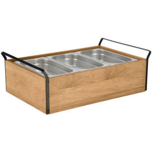Esino rashladna vitrina se sastoji od visoke donje kutije napravljene od hrastovog drveta, donjeg poslužavnika napravljenog od visokokvalitetne plastike otporne na toplotu do 70°C, odgovarajućeg polietilenskog hladnog paketa i tri GN posude koje se mogu slagati jedna na drugu prečnika 1/3, dubine 6,5 cm, napravljene od nerđajućeg čelika hrom-nikl 18/10, otporne na rđu, sa praktičnim ekscentrikom za slaganje, ojačanim uglovima i ivicama i litarskom skalom. GN posuda se može prati u mašini za sudove, svi ostali delovi nisu. Odgovarajući poklopac sa rolo poklopcem, higijenska zaštita i table za etiketiranje dostupni su zasebno.