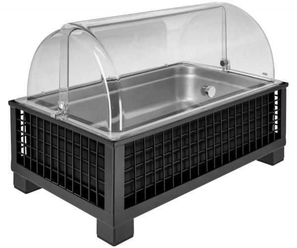 Set se sastoji od složene buffet kutije visoke izrađene od čelika obloženog prahom, osnovnog kontejnera izrađenog od visokog...kvalitetna plastika sa toplotnom otpornošću do 70°C, odgovarajući hladni paket napravljen od polietilena, 10 cm duboki GN kontejner napravljen od 18/10 hrom-nikla nerđajućeg čelika.