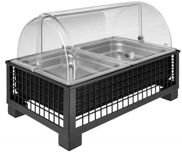 Set se sastoji od složene bife kutije visoke izrađene od čelika obloženog prahom, osnovnog kontejnera izrađenog od visokokvalitetne plastike sa toplotnom otpornošću do 70°C, odgovarajućeg hladnog pakovanja napravljenog od polietilena, 2x 6.5 cm dubok GN kontejner 1/2 izrađen od 18/10 hrom-nikl nehrđajućeg čelika.