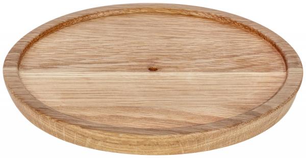 Okrugla drvena daska od nauljenog hrastovog drveta. Udubljenje daske sprečava da vaše kreacije padnu. Na tri udubljenja na dnu daske, može se pričvrstiti ili set za noge ili priložene klizače. Sa odgovarajućim čeličnim komadima, možete fleksibilno sastaviti svoj etagere od 1 do 3 sloja, ovisno o tome kako ga trenutno koristite. Jednostavna njega. Nije pogodno za mašinu za pranje sudova.
