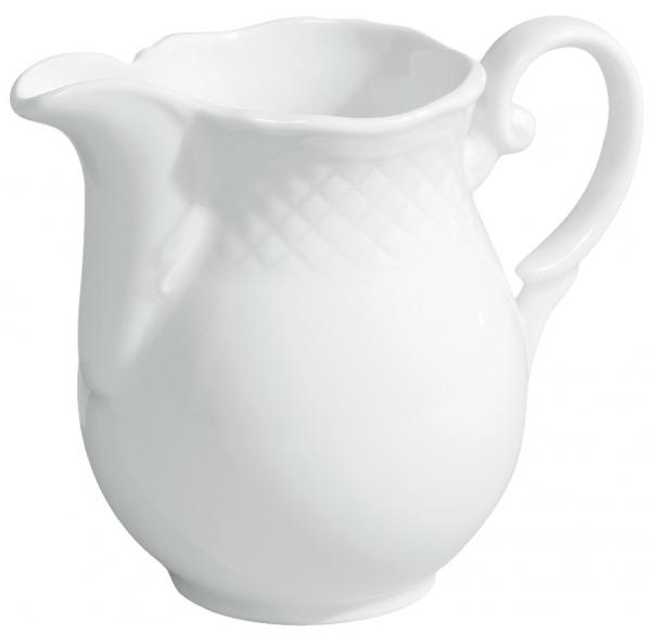 Bijeli porcelanski bokal. Sa klasičnim elegantnim reljefom. Može se prati u mašini za sudove i može se koristiti u mikrotalasnoj pećnici.