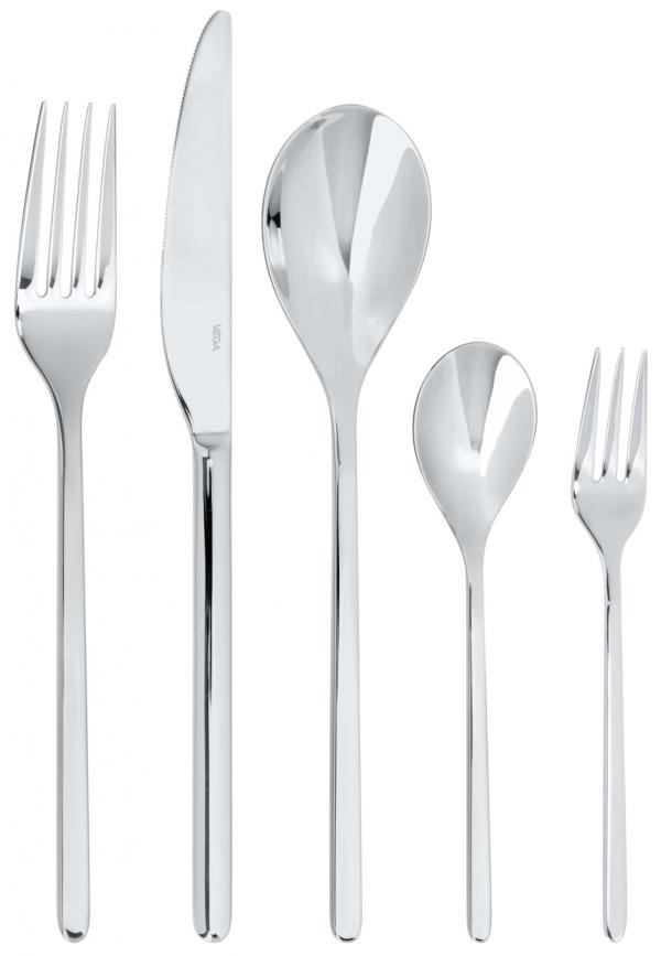 Hrom-nikl nerđajući čelik 18/10 (stoni nož 13/0). Set za šest osoba sastoji se od šest kašika, viljuški za sto, noževa za sto, kašičica za kafu i viljuški za kolače. Bezvremenski set pribora za jelo jednostavnog oblika. Poliran kao ogledalo. Viljuška za sto: dužina 20,5 cm. Nož za sto (monoblok 13/0): dužina 23 cm. Kašika za sto: dužina: 20,5 cm. Viljuška za sto: dužina 14,5 cm. Tanle kašika: dužina 14,5 cm. Debljina materijala 7 mm (mereno na najdebljem mestu viljuške). Može se prati u mašini za sudove.