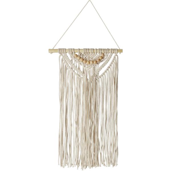 Zidna dekoracija napravljena od pamuka u macrame stilu, ukrašena drvenim perlama.