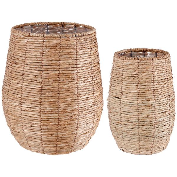 Set saksija od dva komada napravljen od vodenog zumbula sa metalnim okvirom i folijom unutra kako bi zaštitila prirodni materijal od vlage. Dimenzije male: dno 20 cm, Ã ̃ top 21 cm, visina 39,5 cm. Dimenzije velike: Ã ̃ dno 29 cm, Ã ̃ top 31 cm, visina 47 cm.