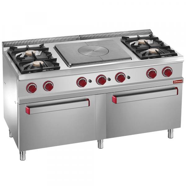 Šporet sa 4 gorionika sa centralnim dijelom solid top, 2 plinske peći GN 2/1