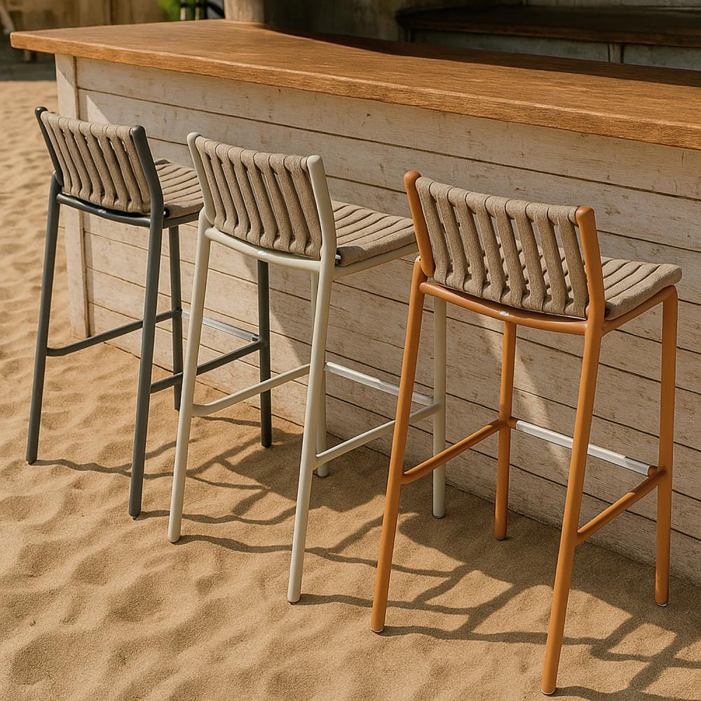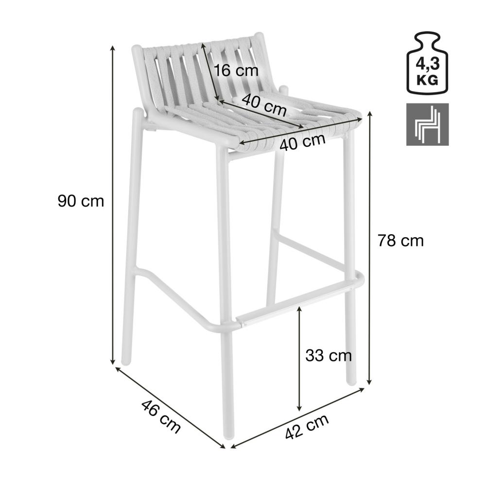 This high-quality catering outdoor bar chair has been specially developed for professional use in restaurants, cafés, bars and hotels. The sturdy powder-coated aluminium frame makes the bar chair lightweight, corrosion-resistant and ideal for frequent moving and daily outdoor use. The seat and backrest upholstery is made of quick-drying Rope wicker, which is ideal for sunny terraces, rooftop bars or outdoor areas with intensive use thanks to its high robustness and UV resistance. Thanks to its stackable design, the bar stool can be stowed away quickly and space-savingly - a great advantage for everyday catering. The outdoor bar stool is delivered fully assembled and is ready for immediate use. Thanks to its ergonomic shape, it offers a high level of seating comfort even without a cushion. Plastic glides also protect the floor and make it easier to move. Advantages for the catering & hotel industry: * Modern outdoor bar stool for restaurants, bars & cafés * Powder-coated aluminium frame - sturdy, lightweight & easy to clean * Quick-drying Rope wickerwork - weatherproof & UV-resistant * Stackable - ideal for flexible outdoor areas * High seating comfort even without cushions * With plastic glides - floor-friendly & low-noise * Delivered assembled - ready for immediate use * Ideal for terraces, outdoor bars, roof terraces & lounge areas This gastro outdoor bar stool combines modern design with high resilience and first-class weather resistance - the perfect seating solution for professional outdoor areas in the catering and hotel industry.