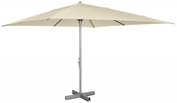 Odgovarajuće postolje suncobrana sa pločama već je uključeno u isporuku. Za unakrsno postolje preporučuju se četiri betonske ploče (min. 50 × 50 cm, svaka 30 kg – nisu uključene) radi maksimalne stabilnosti. U paketu se nalazi i zaštitna navlaka sa šipkama od fiberglasa koja pouzdano štiti suncobran od vremenskih uticaja. Rezervne navlake dostupne su na upit.
