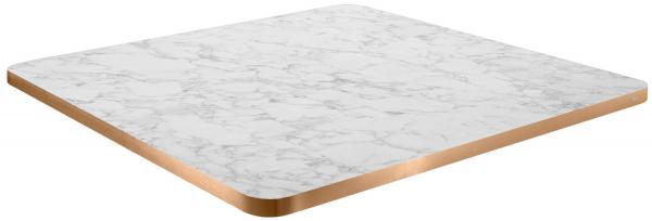 Robusni stolni vrhovi sa premazom visokokvalitetnog laminata sa modernim mermernim dekorom. Premaz čini vrh stola veoma otpornim i u skladu je sa zahtevima DIN EN 438-3:2005. Sa stabilnom dekorativnom ivicom otpornom na udarce u aluminijumu od 2 mm, brušenom i anodizovanom. Kompaktan, mokar brisač i otporan na ogrebotine.