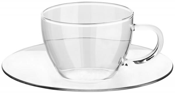Šolja za espresso i tanjir od borosilikatnog stakla. Može se prati u mašini za suđe.