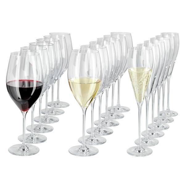 Set od 18 komada koji se sastoji od po šest čaša za crno vino, bijelo vino i čaše za šampanjac. Može se prati u mašini za pranje sudova