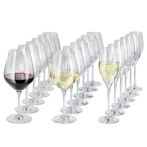 Set od 18 komada koji se sastoji od po šest čaša za crno vino, bijelo vino i čaše za šampanjac. Može se prati u mašini za pranje sudova.