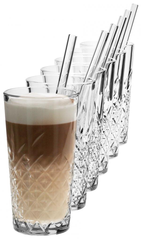Set se sastoji od 6 čaša za macchiato i 6 staklenih slamki. Čaše su napravljene od kaljenog stakla i stoga su idealne za sve vrste pića. Čaše imaju moderan reljef spolja, mogu se slagati i mogu se skladištiti kako bi se uštedeo prostor. Slamke su napravljene od borosilikatnog stakla i stoga su idealne za tople napitke. Uključena je odgovarajuća četkica za čišćenje slamki.