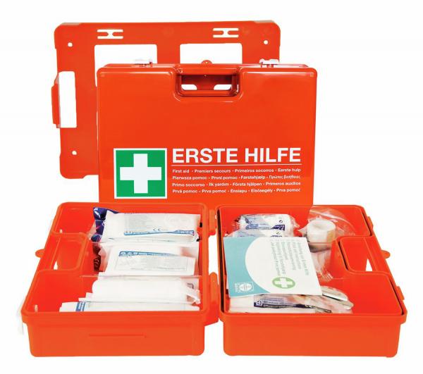 Sa sadržajem prema DIN 13157 (64 komada). Kućište napravljeno od robusne ABS plastike, sa zidnim nosačem i gumenim pečatom. Sadržaj strogo kontrolisan u skladu sa Zakonom o medicinskim proizvodima. Kutija za prvu pomoć opremljena je plavim gipsima koji se mogu detektovati. To ga čini idealnim kompletom za prvu pomoć za prehrambenu industriju. Gips koji se može detektovati može se prepoznati pomoću detektorske mašine. Dakle, oni ne kontaminiraju hranu u slučaju da gips ikada uđe u proizvodnju. Plava boja gipsa koji se može detektovati obezbeđuje dobro vizuelno prepoznavanje, jer se savršeno izdvajaju od hrane - za veću higijenu i bezbednost u proizvodnji hrane. Pored toga, komplet za prvu pomoć ima veoma praktične unutrašnje pregrade. Unutrašnji odjeljci osiguravaju red i jasnoću. To znači da je u hitnim slučajevima, oprema prve pomoći spremna za brže rukovanje. U zavisnosti od vrste i veličine preduzeća, oprema za prvu pomoć mora biti spremna u skladu sa propisima o sprečavanju nesreća udruženja za osiguranje od odgovornosti poslodavaca. U zavisnosti od broja zaposlenih, kao osnovna oprema moraju biti dostupni sledeći kompleti prve pomoći: Proizvodna i prerađivačka preduzeća: 1 - 20 zaposlenih 1x DIN 13 157 21 - 100 zaposlenih 1x DIN 13 169 na 100 dodatnih zaposlenih 1x DIN 13 169 Administrativna i komercijalna preduzeća: 1 - 50 zaposlenih 1x DIN 13 157 51 - 300 zaposlenih 1x DIN 13 169 na 300 dodatnih zaposlenih 1x DIN 13 169 * Za brzu pomoć u slučaju nužde * Kutija napravljena od robusne ABS plastike, udarca i loma otporna * Kutija prve pomoći sa zidnim nosačem, može se objesiti centralno dostupna * 4 - 5 godina trajno