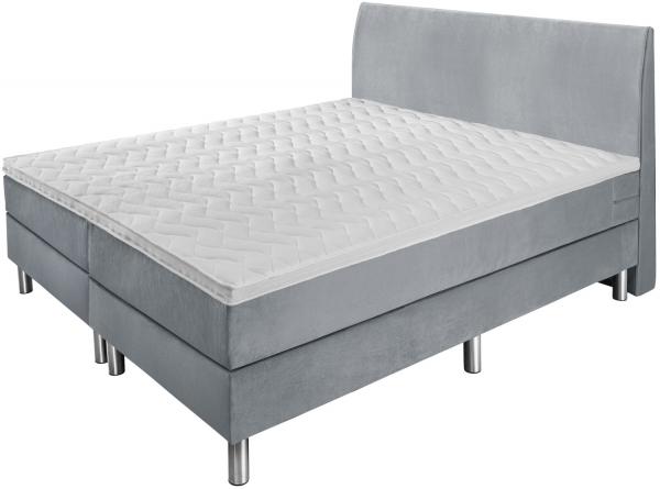 Proljetni krevet u praktičnom kompletu. Prazna kutija. Chipboard okvir. 5-zonski džepni proljetni madrac. Hladna pjena topper za udoban san. Klasična, ravna uzglavlja. Srebrna čelična stopala. Visina za spavanje: 58 cm Visina: Stopala 16 cm + kutija 20 cm + dušek 17 cm + topper 5 cm; Ukupna visina: 58 cm. Sa velurovim pokrivačem. Dostupno kao jednokrevetni ili dupli krevet. Isporučuje se sa povezanim elementima. Dostupan u svijetlosivoj i tamnoplavoj boji.