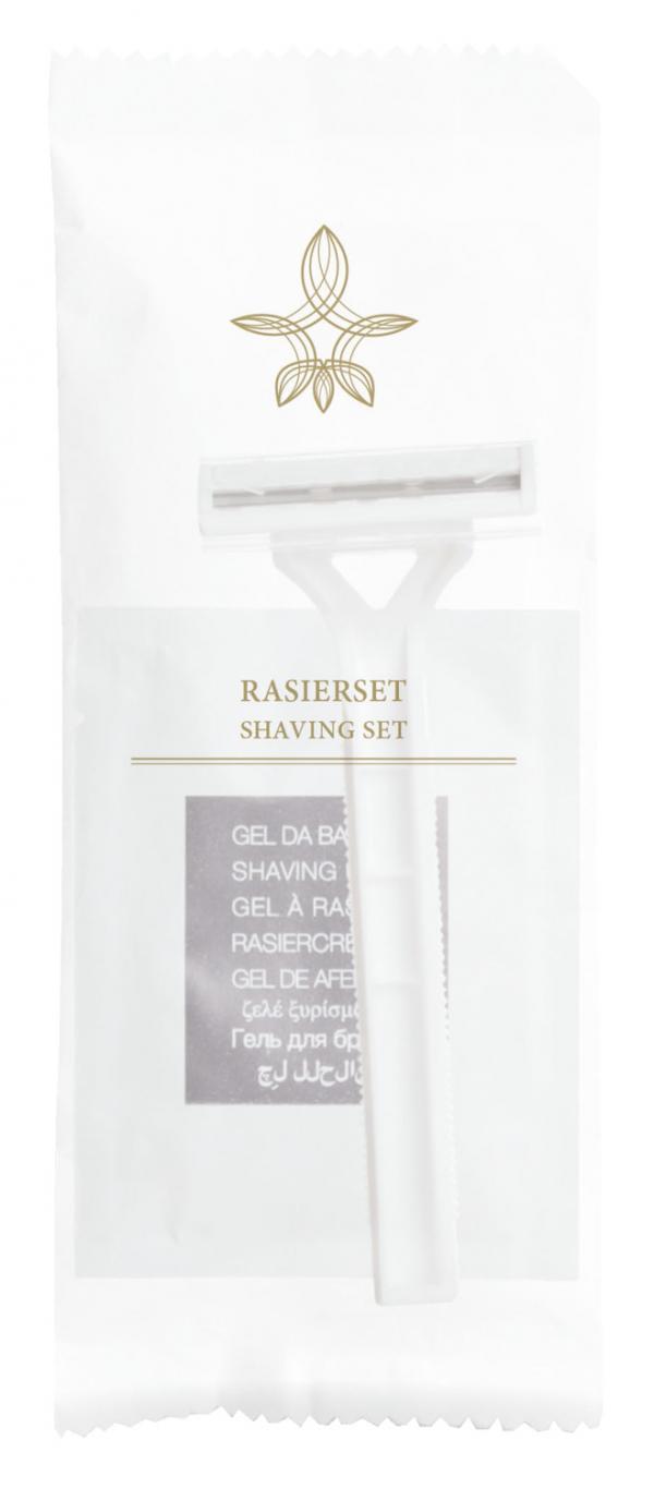Set za brijanje uključuje britvu sa duplom oštricom i kesica sa gelom za brijanje od 6 ml. Kompleti se isporučuju higijenski u pojedinačnom pakovanju.