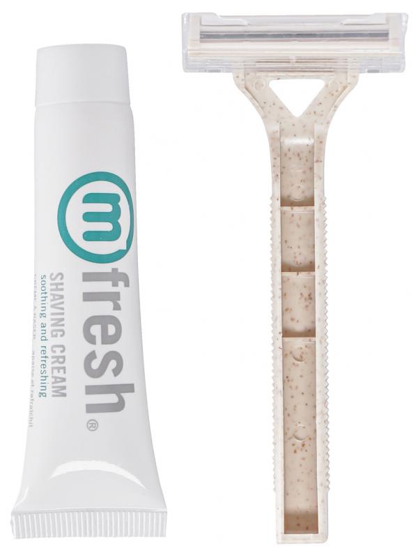 Komplet set za brijanje dio je ekološki prihvatljive hotelske kozmetičke serije V-Touch Nature, koja je napravljena od obnovljivih sirovina (kukuruz/slama skrob). Još jedan plus je ekološki prihvatljiva ambalaža. V-Touch Nature kompletira opremu vašeg gostionskog kupatila. Set za brijanje sastoji se od brijača i kreme za brijanje (15 g) u vrećici.