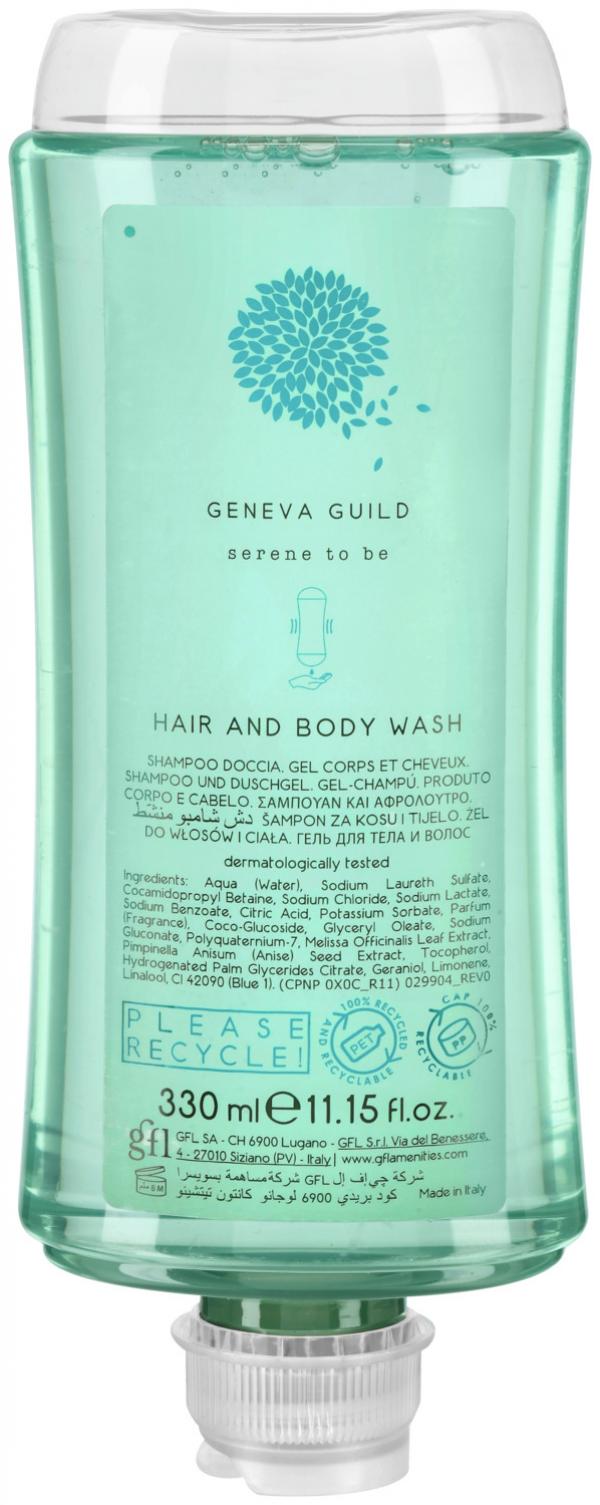 Blagi kombinovani šampon za kosu i gel za tuširanje Geneva Guild. Proizvod za njegu dva u jednom u svojoj klasi. Šampon i gel za tuširanje za nježno čišćenje pogodni su za sve tipove kose i kože. Izuzetne nijanse mirisa pružaju osjećaj svježine i higijene. Obogaćen ekstraktima organskog zelenog anisa i matičnjaka. Dermatološki testiran i pH neutralan! Ambalaža koja se može reciklirati. Sadržaj: boca sa dozatorom od 330 ml od reciklirane plastike. Odgovarajući držač naručite posebno.