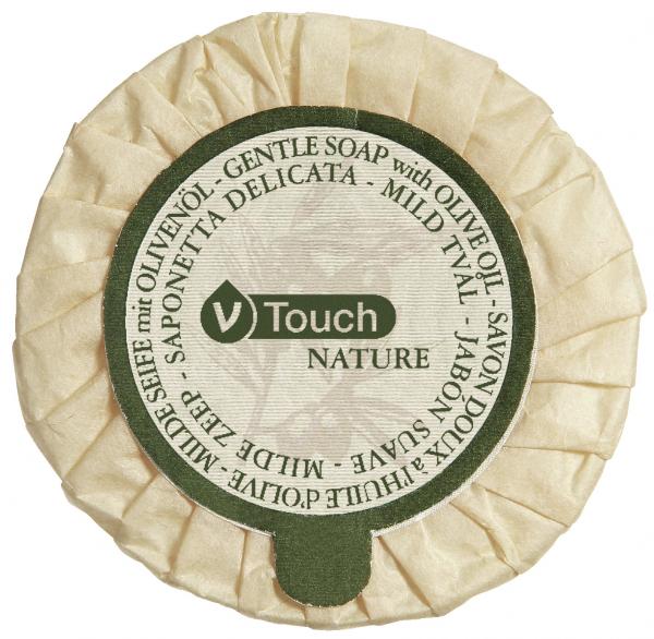 V-Touch Nature mirisni mekani sapun napravljen je od sastojaka na bazi biljaka. Nježno pjenasti, okrugli sapun za ruke nježno i pouzdano čisti ruke i lica i ostavlja dugotrajan miris. Ovaj mekani sapun s visokokvalitetnim maslinovim uljem njeguje kožu i odiše rajskim, okrepljujućim mirisom limuna, ruže i bora. Dermatološki testirano. Sapun je biorazgradiv. Svakih 16 g sapuna za ruke je pojedinačno umotano u papir. Štampano sa prirodnim izgledom.