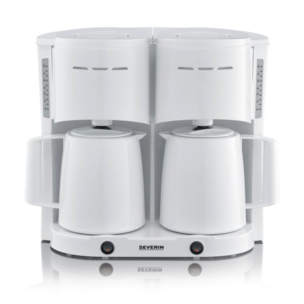 Dvostruki aparat za kafu koji omogućava istovremenu pripremu dva vrča kafe. 2 termos boca sa poklopcem za kapanje. Za 2x 8 šoljica. 2 okretna filtera 1 x 4 sa zaustavljanjem kapanja. 2 dugmeta za uključivanje/isključivanje sa indikatorskim lampicama. Funkcija automatskog isključivanja. 2 pokazivača nivoa vode na prednjoj strani. Integrisani odeljak za kablove. Snaga: 2x 1000 W, neklizajuće gumene noge.