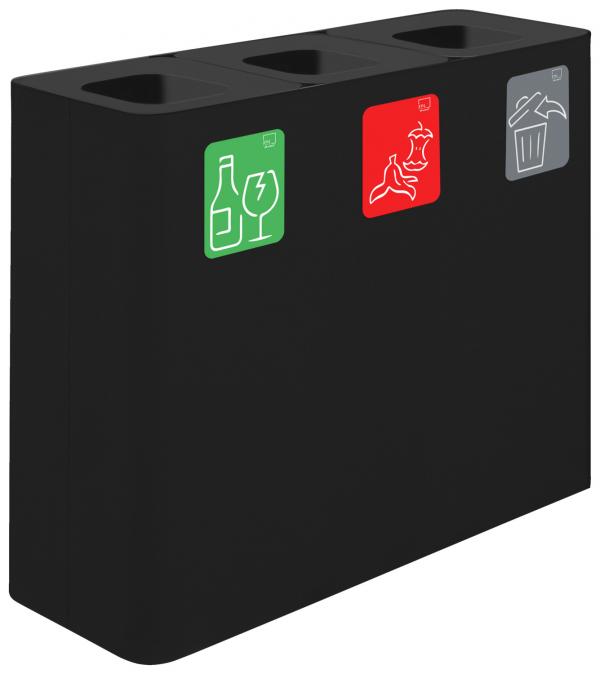 Elegantna, robusna stanica za sakupljanje otpada od pocinčanog čelika premazanog prahom. Ova visokokvalitetna sabirna stanica sa 3 sabirna mjesta ima veliku zapreminu (180 litara), što je čini idealnom za područja s velikom količinom otpada. Idealno za natkrivene vanjske prostore, ulazne prostore, poslovne zgrade, hotele, trgovačke centre, javne objekte. Sa praktičnim unutrašnjim držačem vrećice (stezni prsten), pražnjenje vreće odozgo. Uključuje 5 piktograma napravljenih od aluminijskog kompozita sa simbolima "kanta za smeće", "staklo", "plastika", "papir" i "organski otpad". Zapremina 3 x 60 l.